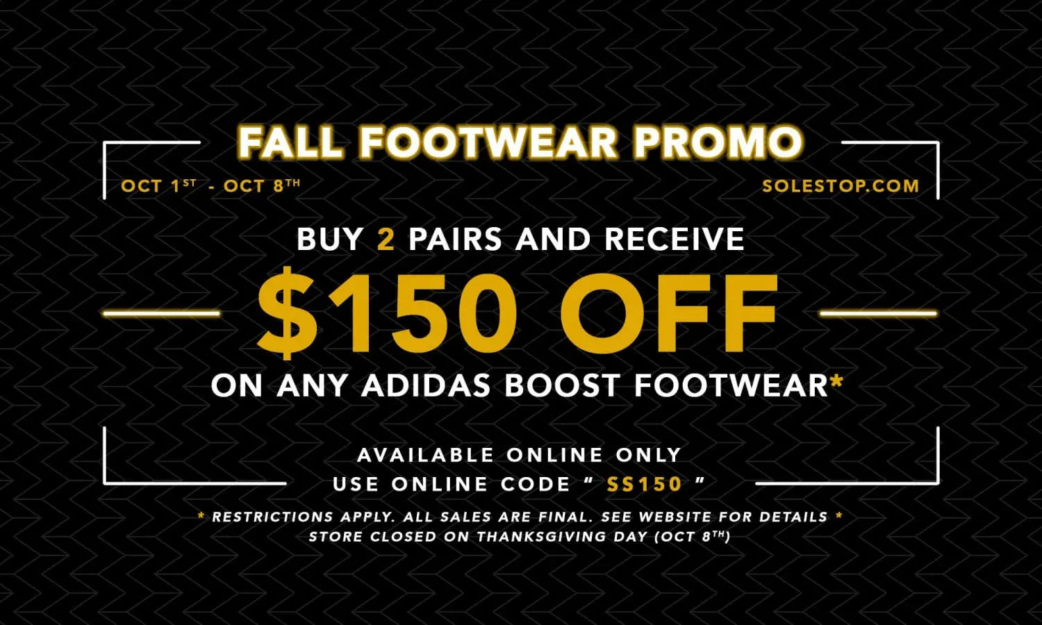 Starting from October 1st to October 8th, purchase any 2 shoes within the adidas boost page and get $150 off with the code "SS150"