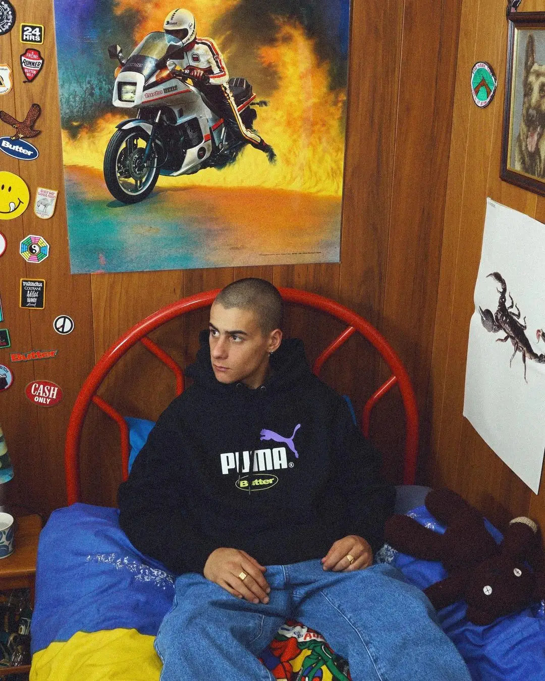The PUMA x BUTTER GOODS collection is all about an appreciation for vintage sports marketing. It harks back to the heyday of sporting clubs, vintage tennis teams, and bold ‘90s skateboard merch in a way that feels fresh and contemporary today. The collection embraces a cultural moment where across professional sportswear, vibrancy, personality and authenticity won out over clinical minimalism. Campaign images play on this theme and feature a '90s-inspired teen skateboarder’s bedroom filled with kitschy items that bring about a sense of nostalgia and feel for the era.