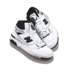 With the new 650 silhouette, New Balance introduces a hi-top counterpart to the wildly popular 550. While 1980s on-court design combined supportive features with epic proportions, the 650 offers a streamlined, ready to wear look. A classic, leather upper is bolstered with a puff and stitch collar, for a subtle reinterpretation of molded foam construction, while a raw edged leather eyerow applies the shoe’s elevated construction to every level of detail.