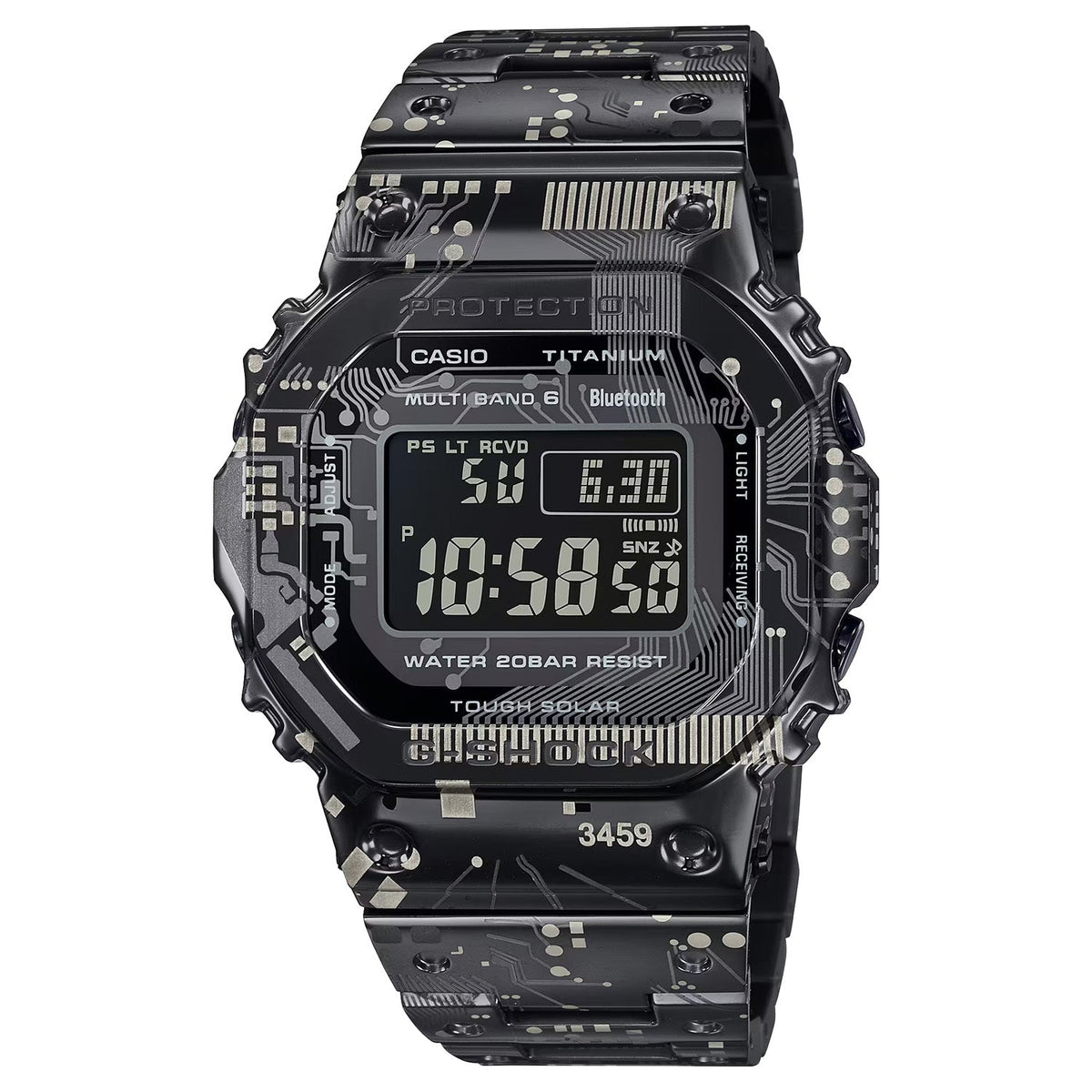 A very special addition to the GMW-B5000 line, the original full metal take on the first-ever G-SHOCK. This unique design features a unique camouflage pattern abstracted from the circuitry of the no. 3459 module of the GMW-B5000. The pattern is rendered in black ion plating and laser engraving, which is applied both before and after the ion plating to create the impression of shading for a pattern of depth and dimension. Made with TranTixxii® titanium alloy developed by Nippon Steel Corporation, this timepiece delivers titanium’s lightweight comfort against the skin, and roughly twice the surface hardness of conventional titanium, for a mirror-finish beauty comparable to stainless steel. Make a statement of maximum impact with this amazing full metal G-SHOCK.