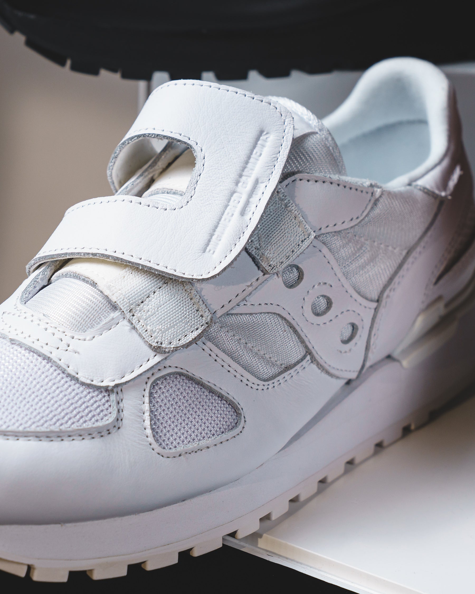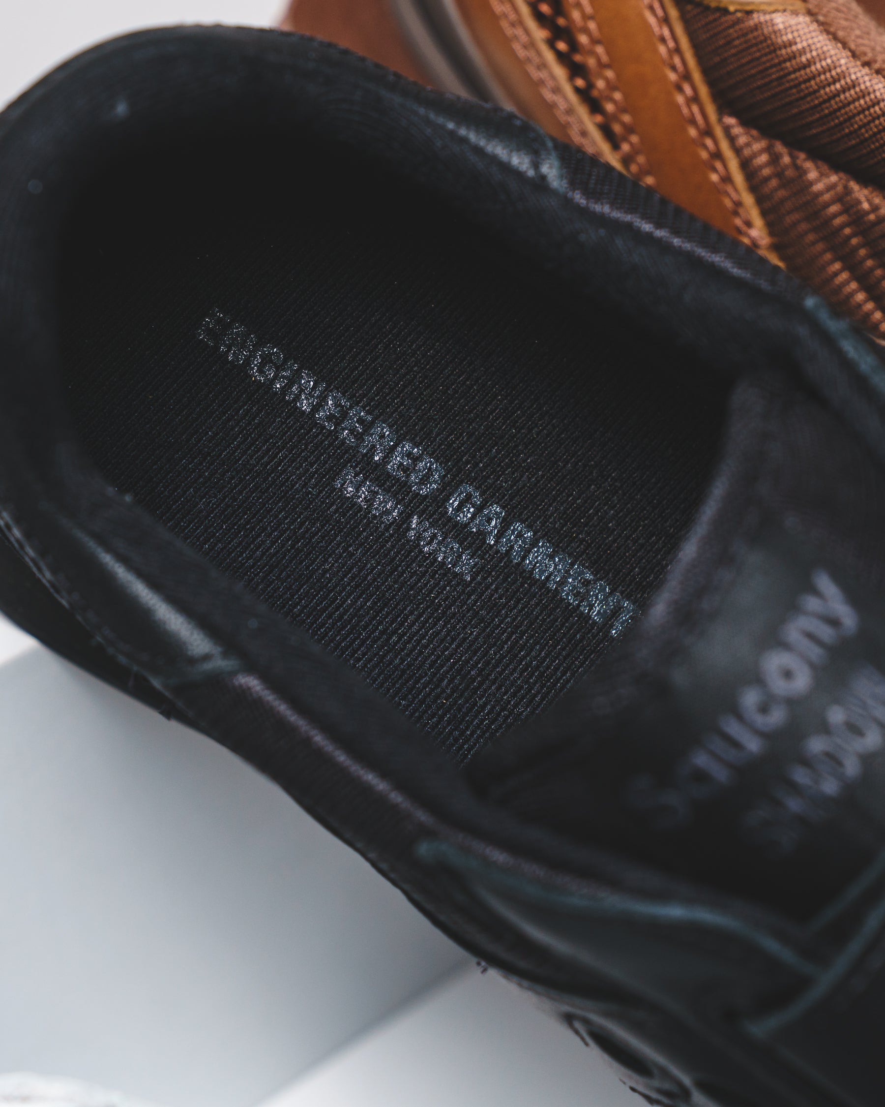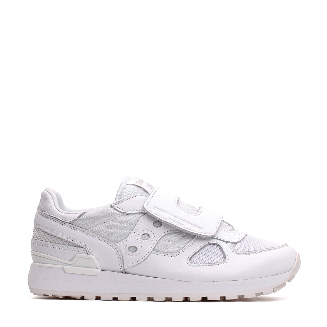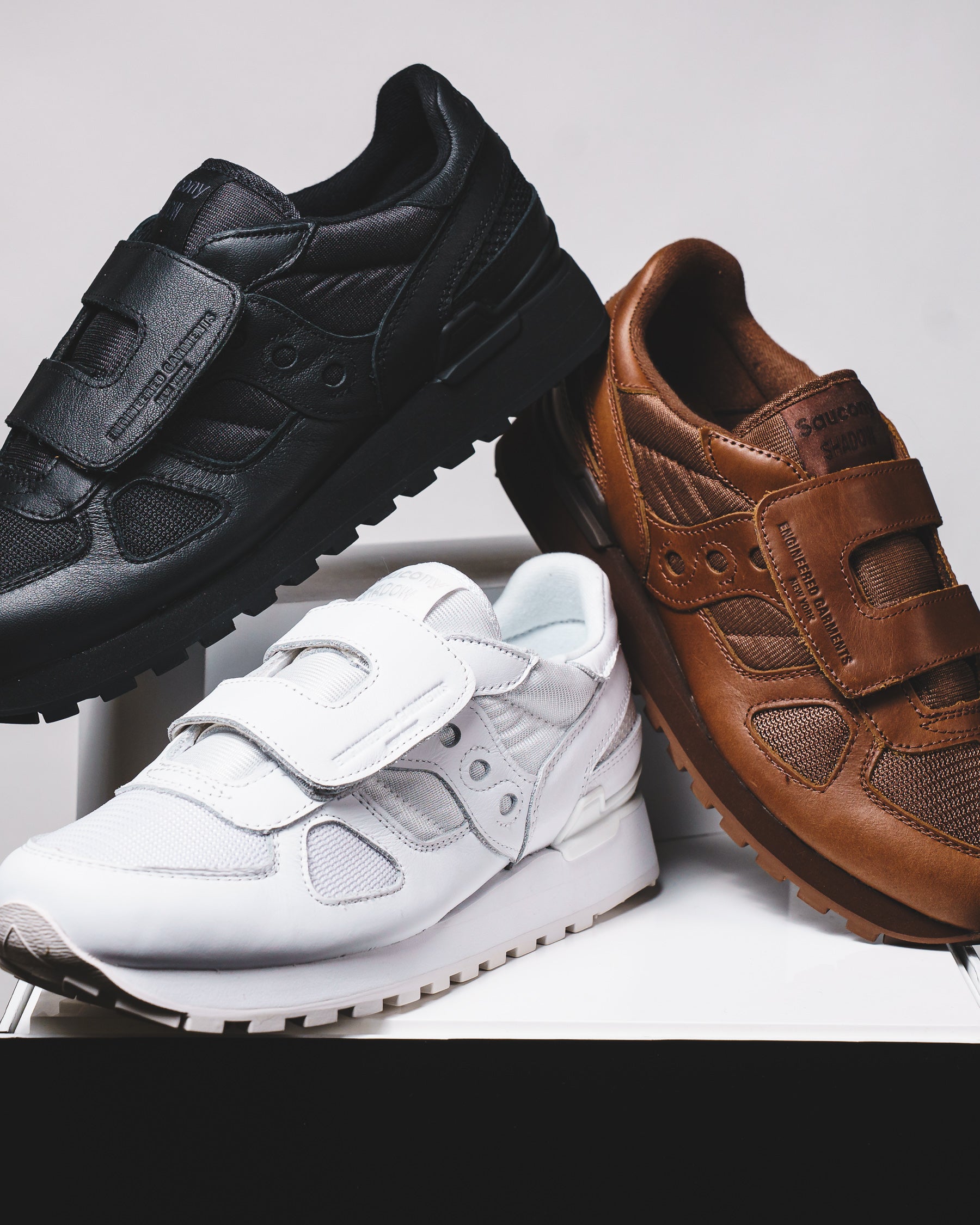 The Engineered Garments x Saucony Shadow Original reimagines the classic Shadow Original with a sleek double-strap design. Available in white, black, and brown, each pair features a mixed mesh and premium leather upper, leather Velcro straps with “Engineered Garments” branding, a debossed Saucony logo on the heel, and a co-branded dust bag.