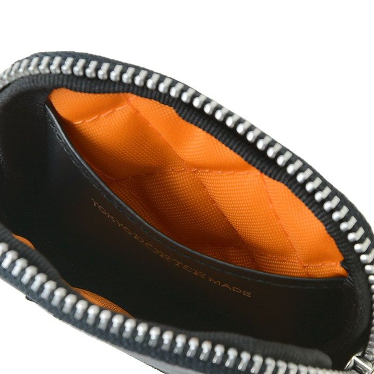 The main material is a nylon twill fabric with an original woodland pattern print, which is typical of camouflage patterns. A bright orange nylon quilted fabric is used for the interior, and a ball chain is used for the zipper pull. The 3 types of wallet, multi-wallet, and key case come with an original carabiner engraved with PORTER.